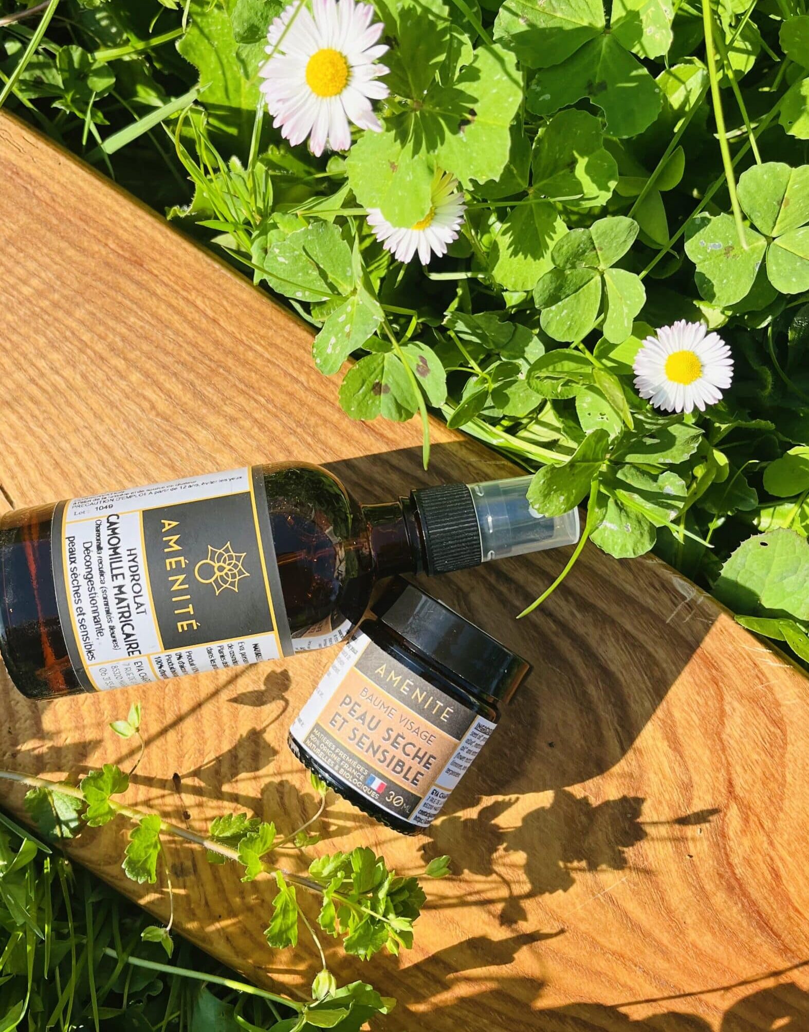 Le BAUME visage peau Sèche et Sensible et l'HYDROLAT de Camomille Matricaire sont des soins apaisants vulnéraire, réparateurs et émollients pour peaux fragiles et irritées.