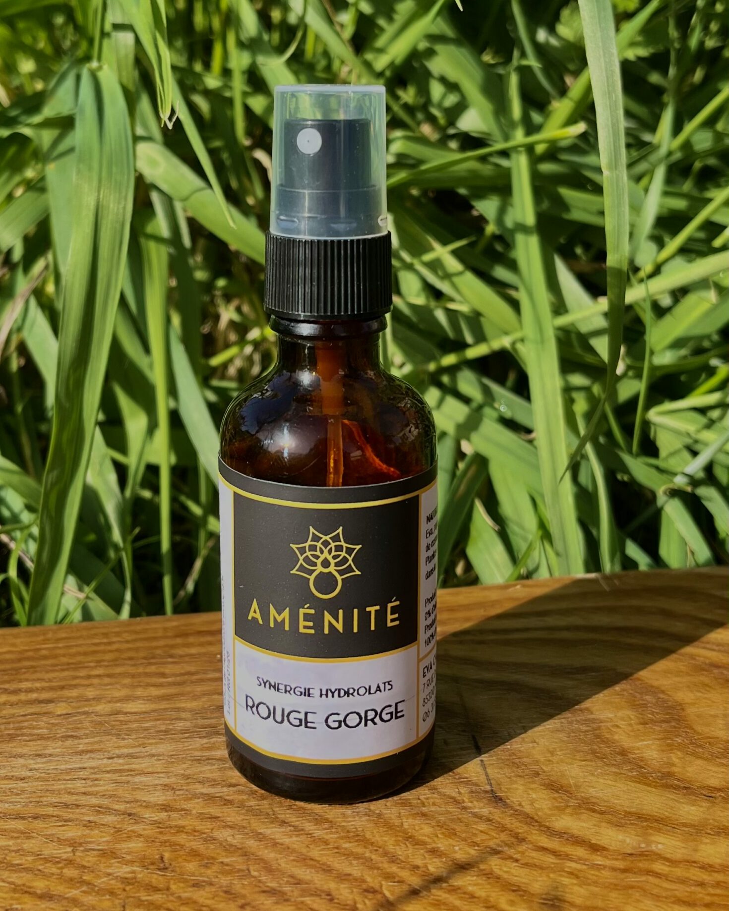 Bouteille en verre ambrée de 50ml avec spray: Hydrolats de Laurier noble, Thym thuyanol, Sarriette des montagnes. Laurus noblis, Thymus vulgaris ct. thujanol, satureja montana (fleurs et feuilles). Notez que les plantes des synergies peuvent être modifiées en fonction des récoltes de l'année.