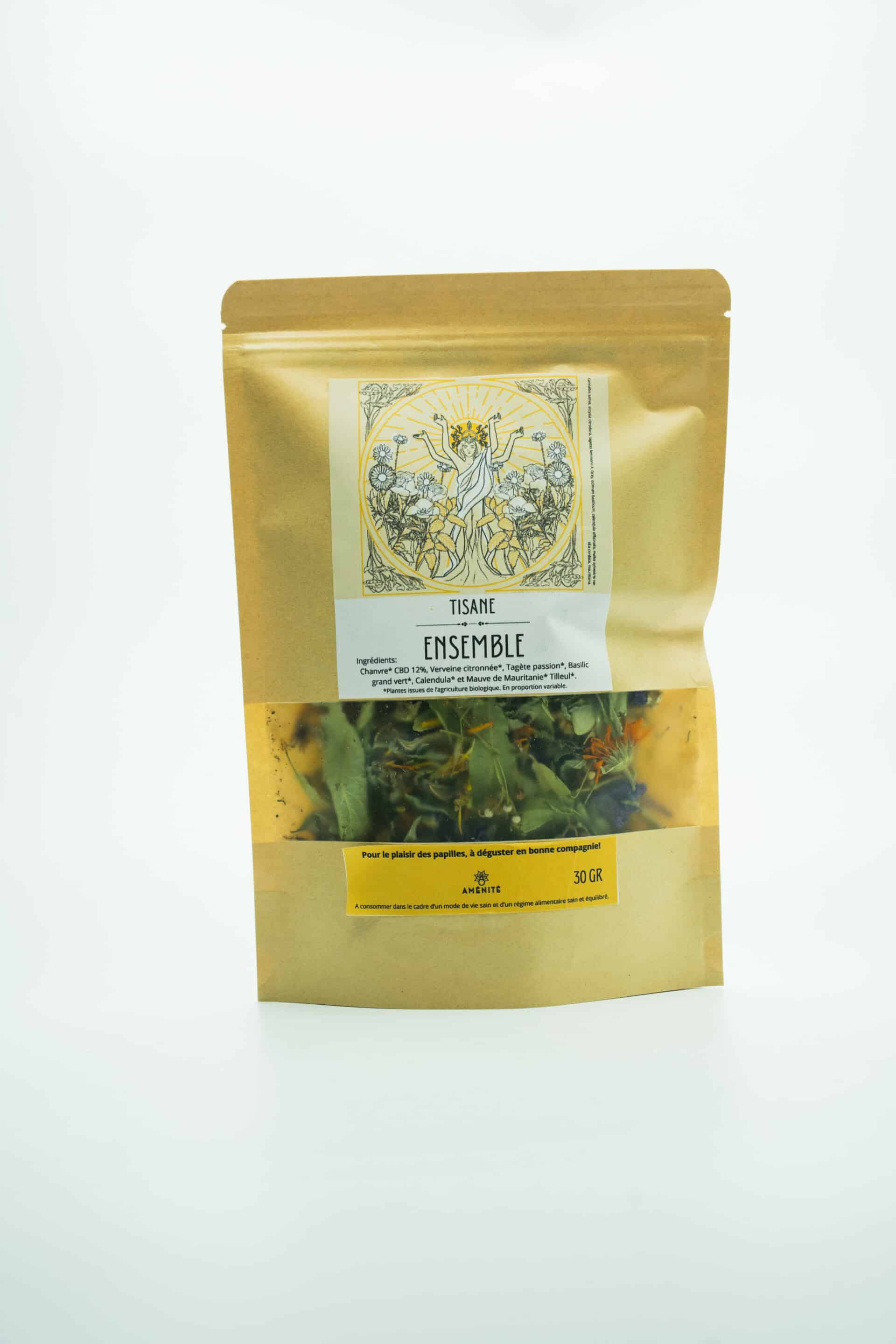 Chanvre CBD (12%), tilleul à petites feuilles, verveine citronnée, oeillet passion, basilic grand vert, mauve de Mauritanie
